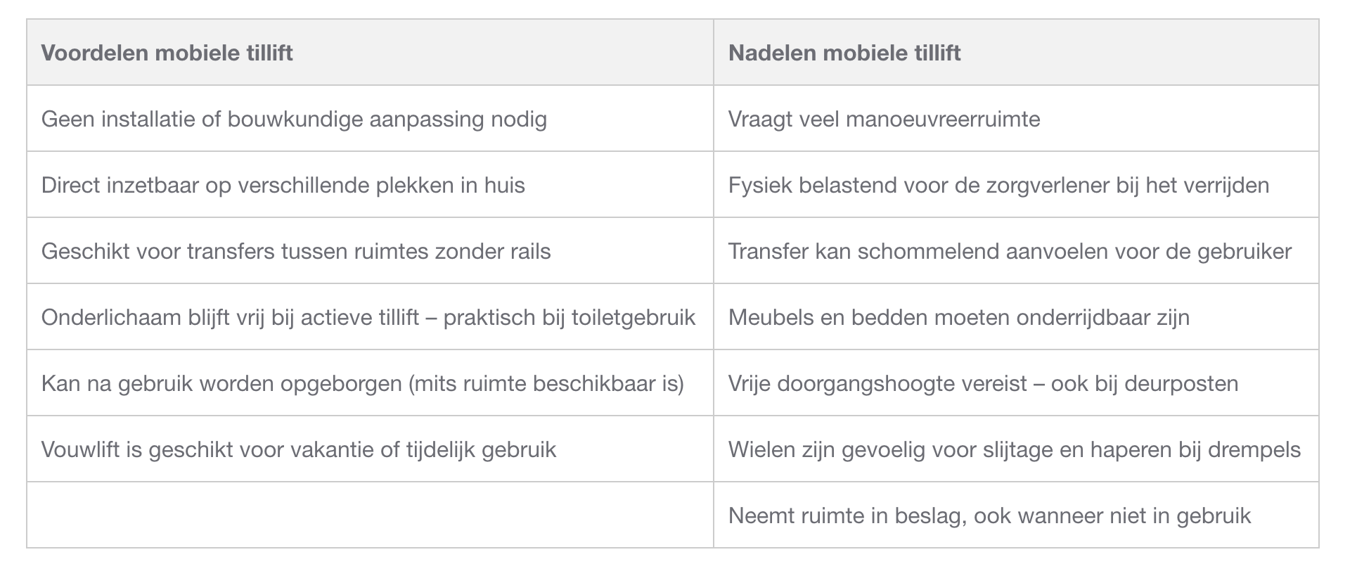 De keuze tussen een mobiele tillift en een plafondlift hangt af van de zorgsituatie, de beschikbare ruimte en de technische (on)mogelijkheden in huis. Hier zie je een overzicht van veelgenoemde voordelen en nadelen van een mobiele tillift in vergelijking met een plafondlift.