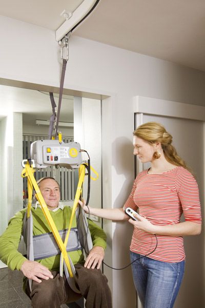Zelfstandig gebruik is dus niet mogelijk: een zorgverlener koppelt de motor aan de rail en beweegt deze handmatig.