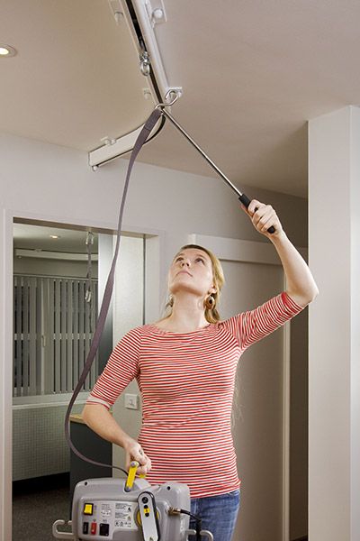 De draagbare plafondmotor is ontworpen om flexibel te gebruiken in meerdere ruimtes. Deze motor wordt handmatig aan een plafondrailsysteem gekoppeld en kan ook weer worden opgeborgen of meegenomen naar een andere ruimte.